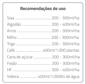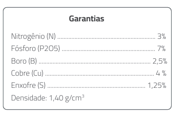 melhor produtividade. Também fornece nutrientes envolvidos na estruturação celular e na fotossíntese. Tem em sua composição Cobre, Boro, Nitrogênio e Fósforo – macro e micronutrientes essenciais, além de aminoácidos. Compatível com a maioria dos produtos de aplicação foliar, deve ser adicionado ao tanque antes dos demais produtos.