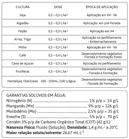 Prime Mn+ é um produto desenvolvido para suprir a deficiência de Manganês (Mn), principalmente em culturas transgênicas RR, onde é comum a deficiência induzida e temporária do Mn, que causa alterações fisiológicas nas plantas, travando seu desenvolvimento e tornando-as suscetível a entrada de patógenos tanto no sistema radicular bem como na parte aérea. Prime Mn+ atua como ativador de enzimas, na síntese de clorofilas e na fotossíntese. Prime Mn+ é um produto quelatizado que contém fosfito de Manganês (Mn), Enxofre (S), Molibdênio (Mo) e aminoácidos em uma formulação especial que conferem alta compatibilidade com herbicidas, fungicidas e inseticidas. Possui ação bioestimulante e antiestresse. Deve ser acondicionado a calda de pulverização antes de quaisquer outros produtos.